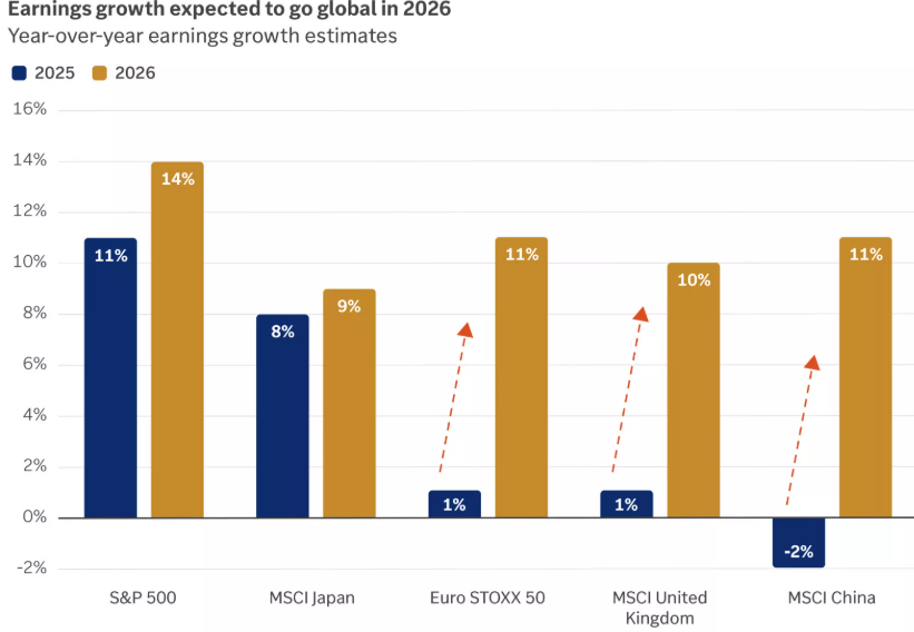 Zhodnocení však bylo taženo právě nárůstem valuací, nikoliv zisků firem. To není dlouhodobě udržitelný vývoj, v letošním roce budou proto muset firmy doručit solidní nárůst zisků, aby své optimistické nacenění obhájily. A očekávání se nedrží při zemi, když by mělo prakticky ve všech regionech dojít ke dvojcifernému růstu zisků. Největší dynamika je poměrně logicky očekávána ve Spojených státech, viz přiložený graf z dílny Edward Jones.